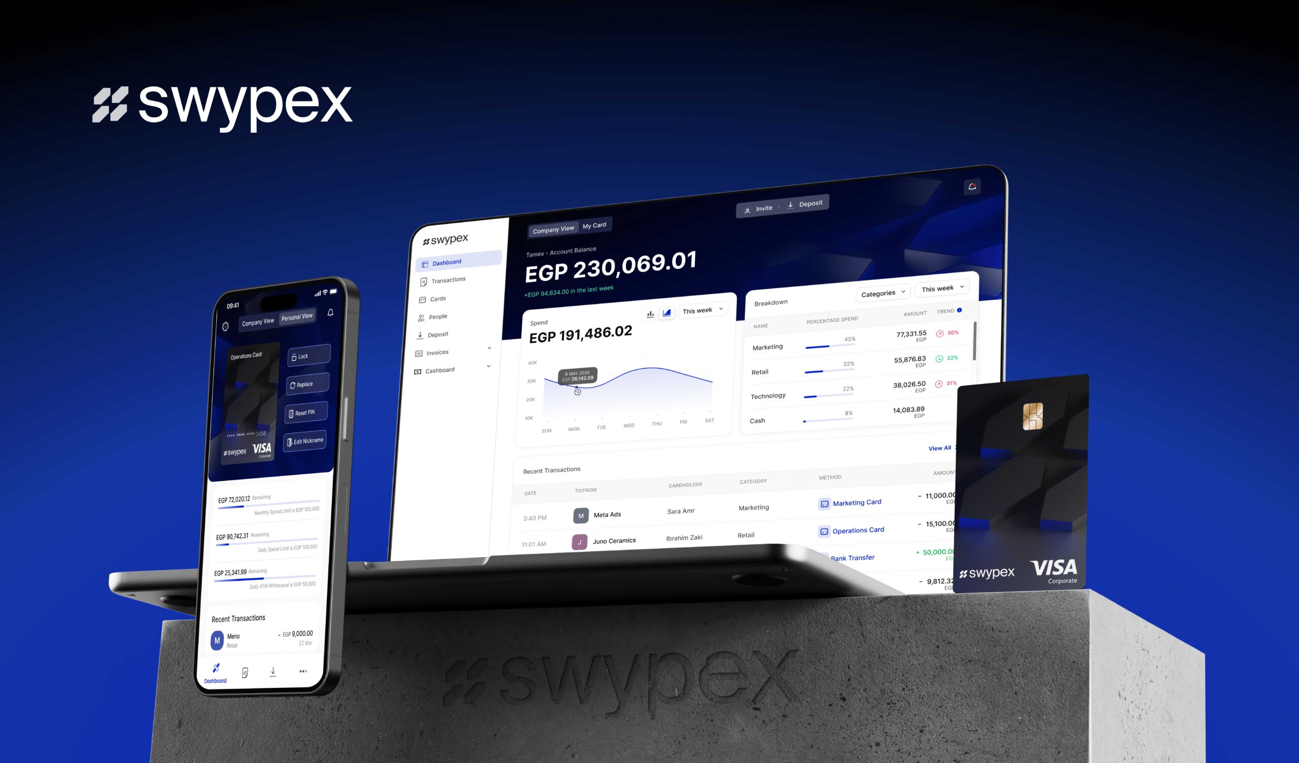 تقوم Swypex بدمج المدفوعات وإدارة الفواتير وبطاقات الشركات الذكية على منصة موحدة. تعمل منتجاتها على تبسيط الإدارة المالية وتمكين الشركات من أتمتة سير العمل المالي وإجراء المدفوعات بسهولة ويسر. وقد صُممت بطاقات Swypex خصيصًا للشركات المصرية من أجل تقليل التكاليف ورفع الكفاءة التشغيلية وتسهيل التطوير والنمو التوسعي.